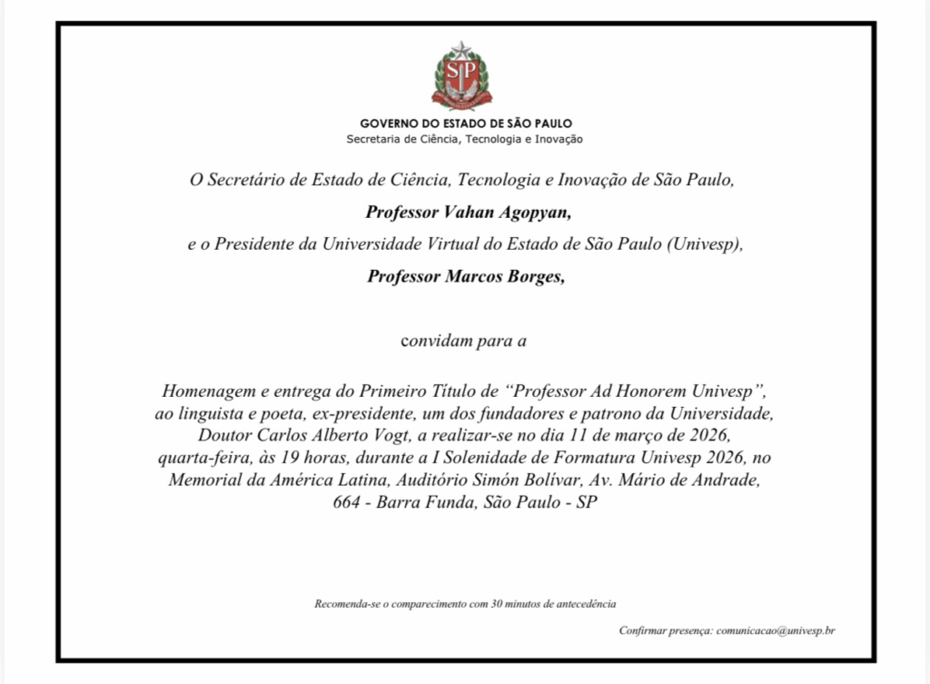 O Governo do Estado de São Paulo, por meio da Secretaria de Ciência, Tecnologia e Inovação, e a Universidade Virtual do Estado de São Paulo (Univesp) realizam, no dia 11 de março de 2026, às 19 horas, no Memorial da América Latina, a cerimônia de homenagem e entrega do primeiro título de “Professor Ad Honorem Univesp” ao linguista, poeta, ex-presidente, um dos fundadores e patrono da instituição, Doutor Carlos Alberto Vogt.