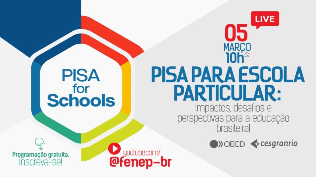 Será realizado no dia 5 de março, às 10h, com transmissão ao vivo, o evento “PISA para Escola Particular: impactos, desafios e perspectivas para a educação brasileira”. A iniciativa discutirá a aplicação do PISA for Schools no contexto das instituições privadas, ampliando o debate sobre avaliação internacional, qualidade da aprendizagem e uso estratégico de dados educacionais. A programação é gratuita e será transmitida pelo canal @fenep-br no YouTube.