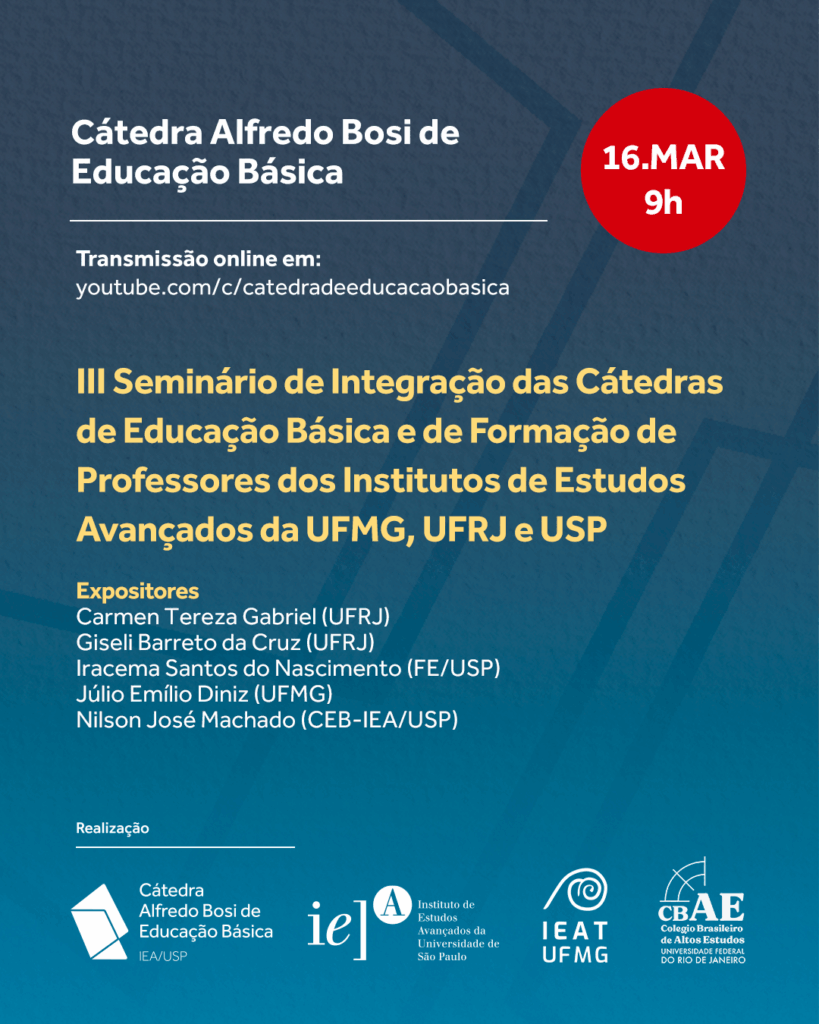 No dia 16 de março de 2026 será realizado o III Seminário de Integração das Cátedras de Educação Básica e de Formação de Professores dos Institutos de Estudos Avançados da UFMG, UFRJ e USP. O encontro é promovido pela Cátedra Alfredo Bosi de Educação Básica (IEA-USP), que é coordenada pela Acadêmica Bernardete Gatti, pela Cátedra Anísio Teixeira de Formação de Professores (CBAE-UFRJ) e pela Cátedra FUNDEP Magda Soares de Educação Básica (IEAT-UFMG).